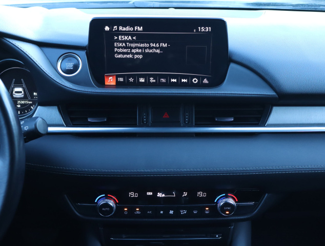 Ta Mazda 6 pochodzi z Polski i jest wyposażona w efektywny silnik benzynowy 2.0 Skyactiv-G o pojemności 1998 cm3 i mocy 164 KM. Samochód posiada automatyczną skrzynię biegów i był użytkowany przez jednego właściciela. Mazda 6 oferuje reflektory bi-ksenonowe, które poprawiają widoczność podczas jazdy nocą. Head-Up Display ułatwia kontrolę parametrów jazdy bez odrywania wzroku od drogi. Klimatyzacja jest automatyczna, co zapewnia wygodę użytkowania. Kierownica jest skórzana i wielofunkcyjna, co zwiększa komfort obsługi. Dodatkowo, system stabilizacji toru jazdy wspiera bezpieczeństwo podczas podróży.